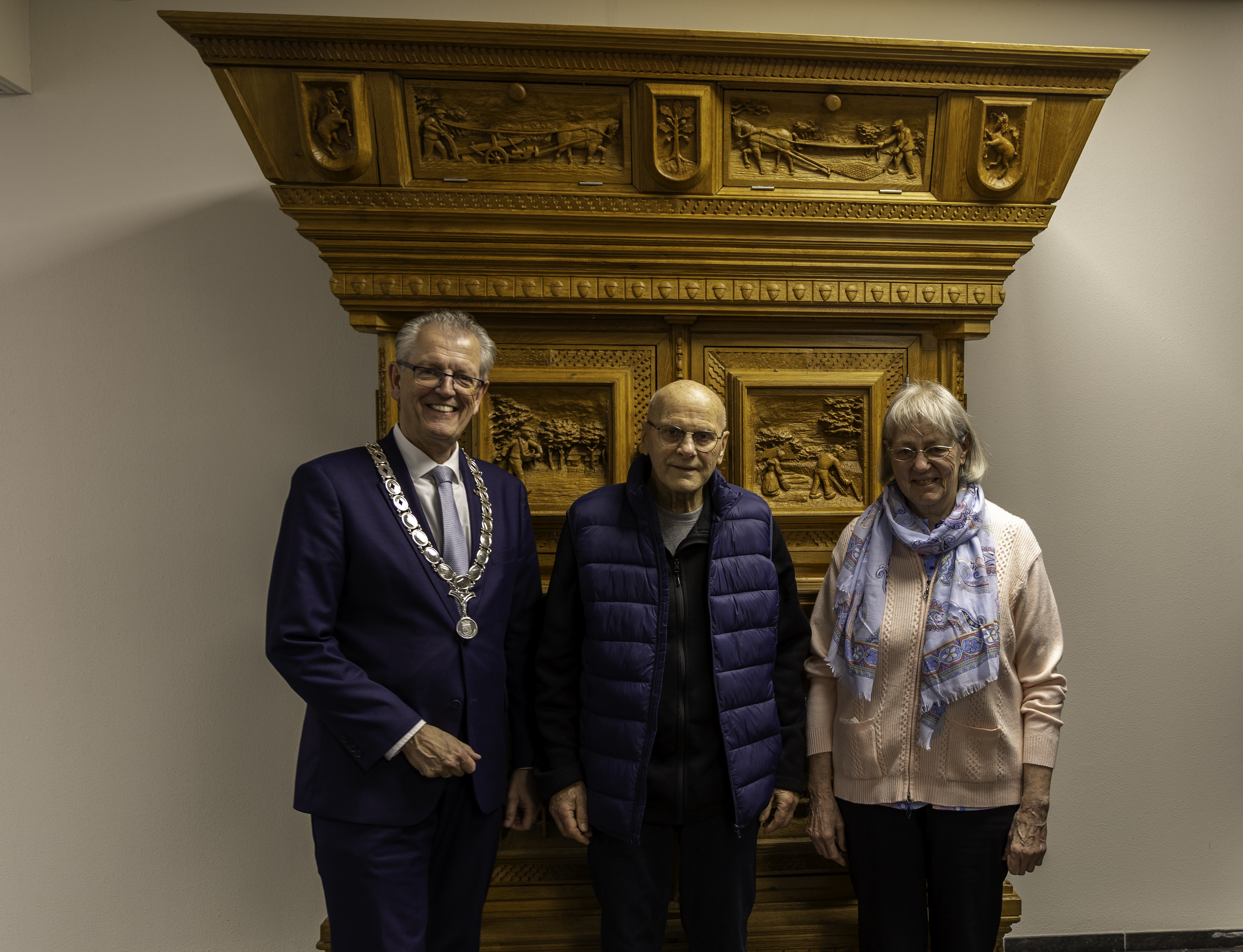 De burgemeester ging dit keer niet op bezoek, maar ontving het diamanten paar in het gemeentehuis. Daar ontstond een bijzonder moment bij de Vjennekast, een kunstwerk dat Henk zelf ontwierp en maakte van oude gebinten. De kast vertelt in houtsnijwerk het verhaal van het boerenleven van vroeger, van ploegen en zaaien tot oogsten en rusten. Bovenin prijkt het wapen van Vriezenveen, geflankeerd door het Twents ros, eikenbladeren en eikels. “Het is mijn levenswerk”, vertelt Henk trots. “Ik wilde iets maken dat de geschiedenis van Vriezenveen vastlegt, en dat is gelukt.”