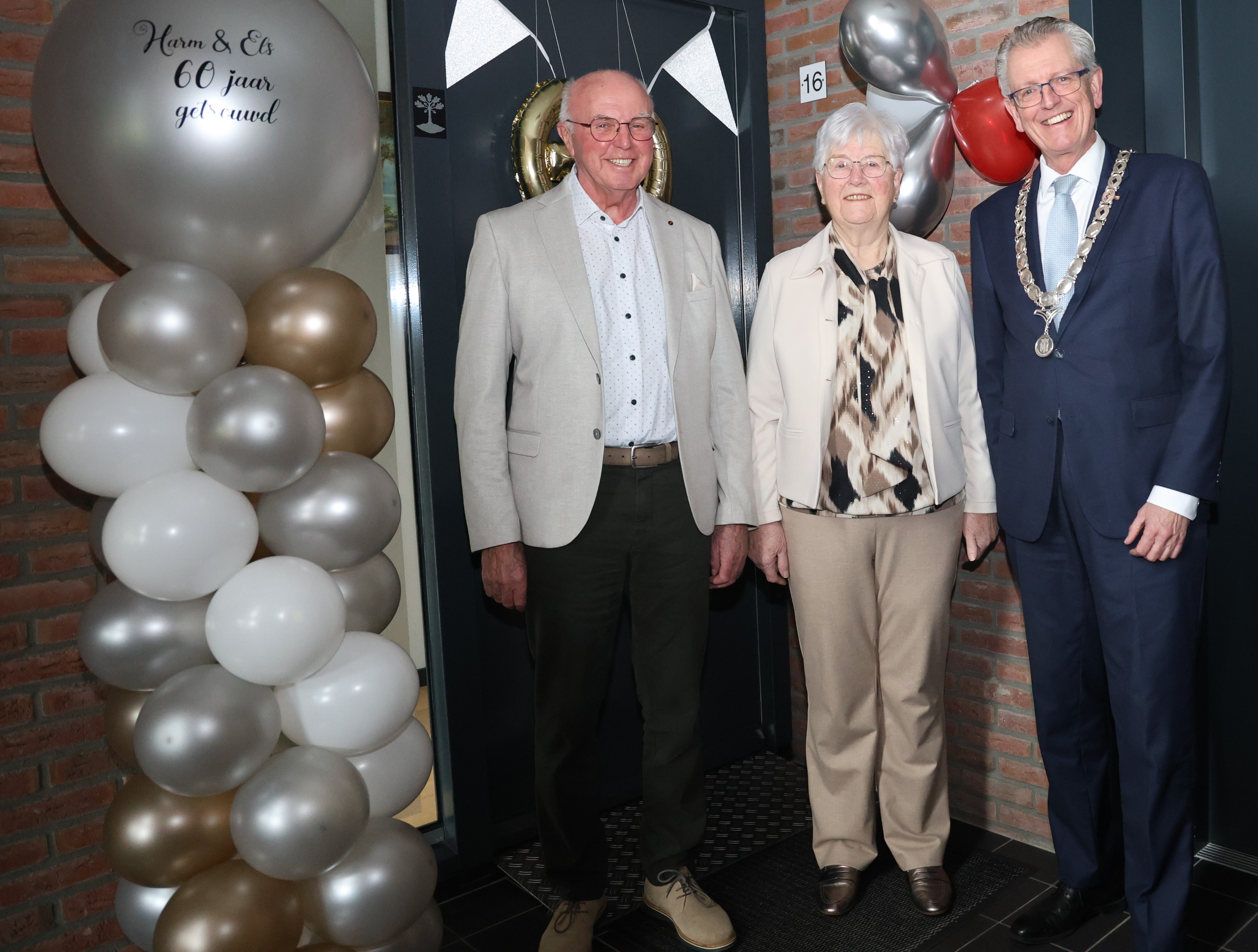 Afgelopen week bracht burgemeester Gerrit Jan Gorter namens het gemeentebestuur een feestelijk bezoek aan Harm en Els Veldhoff, die hun 60-jarig huwelijk vierden. Met een mooi pakket onder de arm feliciteerde hij het echtpaar met deze bijzondere mijlpaal.