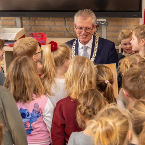 Burgemeester Gerrit Jan Gorter bracht deze week een bezoek aan de kleuters van de Shalomschool in Vriezenveen. Met het prentenboek Kleine Aap van Mies van Hout nam hij de kinderen mee in een vrolijk en herkenbaar verhaal. De klas luisterde met grote ogen, stelde scherpe vragen en genoot zichtbaar van het voorleesmoment. Ook de ambtsketen van de burgemeester trok nieuwsgierige blikken, maar het draaide vooral om het plezier van samen lezen.